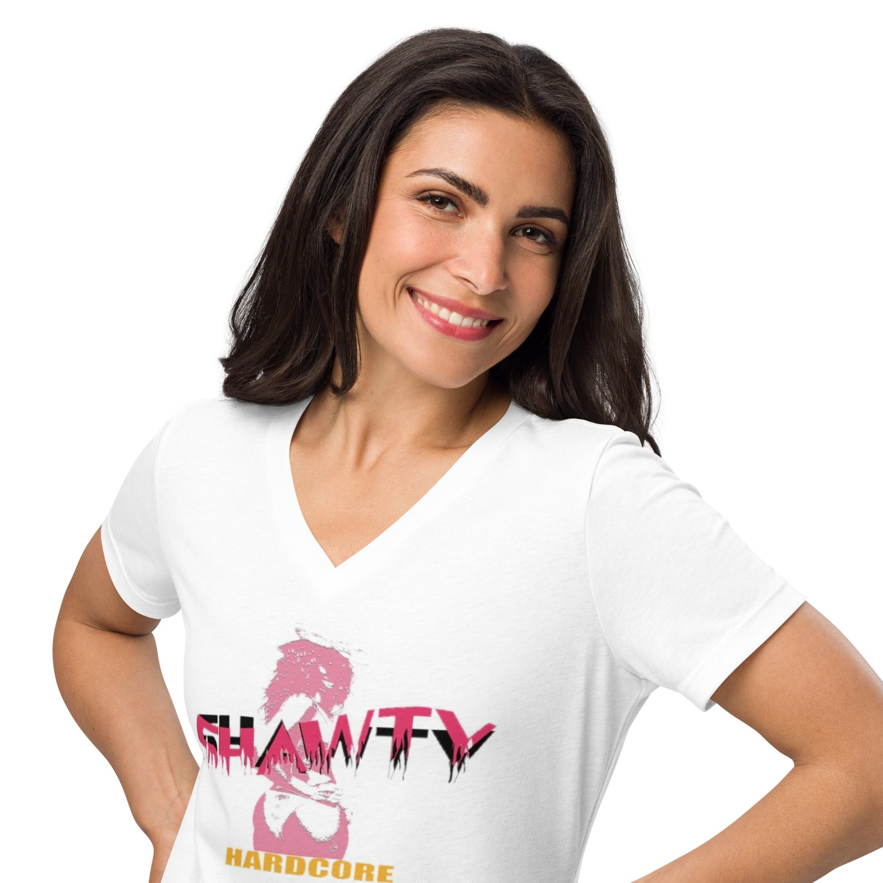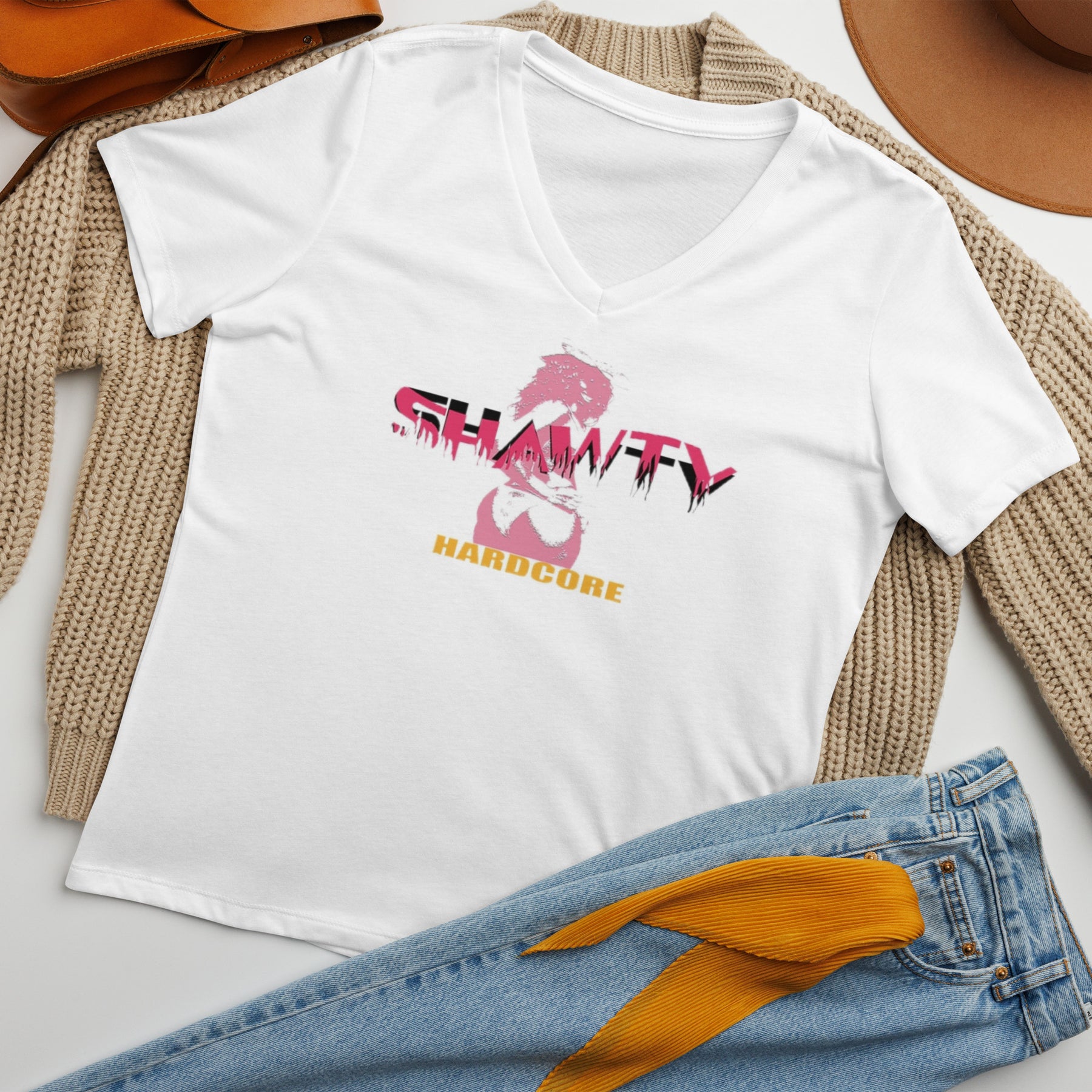 HARDCORE UNIVERSITY SHAWTY Women’s relaxed v-neck t-shirt